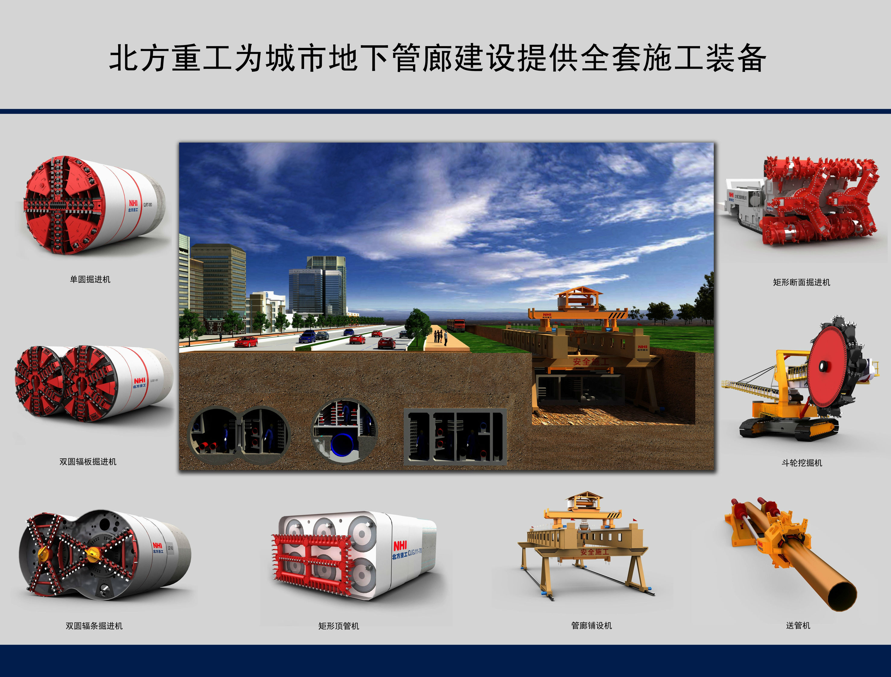 北方重工擁有全套管廊建設(shè)施工裝備解決方案,技術(shù)全面,設(shè)備精良。明挖設(shè)備有矩形斷面掘進(jìn)機(jī)和斗輪挖掘機(jī)。暗挖設(shè)備有單圓掘進(jìn)機(jī)、雙圓掘進(jìn)機(jī)和矩形頂管機(jī)。明挖輔助設(shè)備有送管機(jī)和管廊鋪設(shè)機(jī)等。